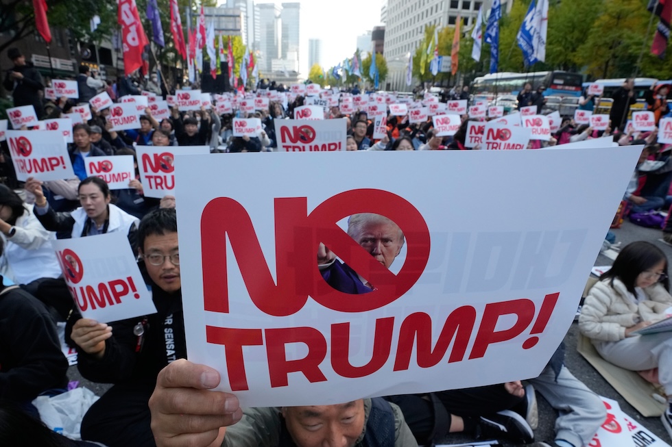 Una protesta contro l’arrivo di Trump a Seul, in Corea del Sud, il 25 ottobre 2025 (AP Photo/Ahn Young-joon)