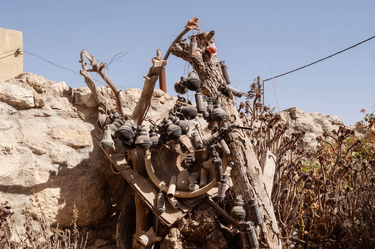 Una delle basi degli attivisti è un edificio basso ad al Tawni, nella zona di Masafer Yatta, la comunità di dodici villaggi palestinesi circondata da colonie israeliane del documentario No Other Land, che quest’anno ha vinto il premio Oscar. Murales, tavolacci, un albero addobbato con una collezione di granate lacrimogene. Dentro c’è gente che cucina e chiacchiera. In maggioranza sono ragazze e ragazzi ventenni, di cui un paio trans, e qualche volontario internazionale. Si definiscono anarchici, senza una struttura organizzata.