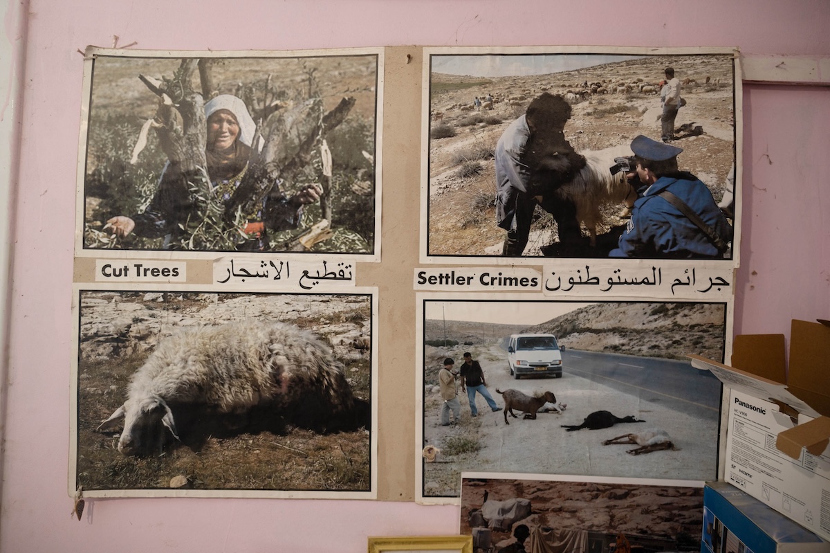 Alcune foto che mostrano gli attacchi dei coloni, nella sede degli attivisti di Al Tawni (Gabriele Micalizzi, CESURA, per il Post)