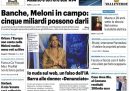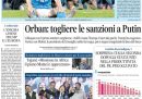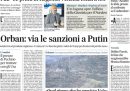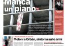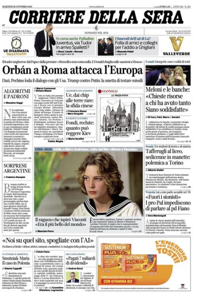 La maggior parte dei giornali di oggi dedica l’apertura alla visita in Italia del primo ministro ungherese Orbán, che ha incontrato la presidente del Consiglio Meloni e papa Leone XIV, e alle sue parole sull’irrilevanza politica dell’Unione Europea e di solidarietà alla Russia, con la critica alle posizioni del presidente degli Stati Uniti Trump sulla guerra in Ucraina. Il Giornale, Libero e la Verità titolano sulla vittoria del partito del presidente argentino Milei alle elezioni legislative di metà mandato e sulla contestazione di un gruppo di attivisti a sostegno della Palestina che ha impedito che si svolgesse un incontro all’università di Venezia a cui partecipava l’ex parlamentare del Partito Democratico Fiano, il Manifesto apre sulla sparizione del “piano casa” dai programmi del governo, e i giornali sportivi commentano l’esonero dell’allenatore della Juventus Tudor e la sua possibile sostituzione con Spalletti.