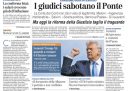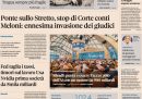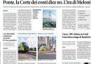 Sulla maggior parte dei giornali di oggi la notizia principale è la decisione della Corte dei conti che non ha approvato la delibera del progetto definitivo del ponte sullo stretto di Messina, provocando la reazione della presidente del Consiglio Meloni che ha accusato i giudici di andare oltre le loro prerogative. Qualche giornale apre invece sulla riforma della giustizia che dovrebbe essere approvata definitivamente oggi dal Senato, prima di essere sottoposta al referendum per entrare in vigore, altri si occupano della situazione nella Striscia di Gaza dove è ripresa la tregua dopo gli attacchi di martedì, e Domani titola sui rapporti fra il Garante per la protezione dei dati personali e Fratelli d’Italia. I giornali sportivi commentano i risultati delle partite della Serie A maschile di calcio giocate ieri, con le vittorie di Inter, Juventus e Roma.