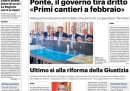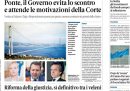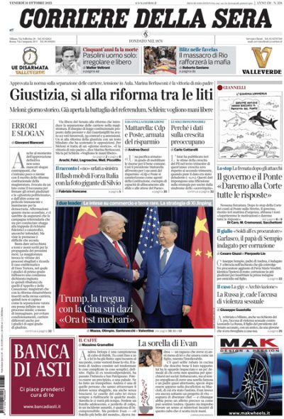 L’approvazione definitiva da parte del Senato della riforma della giustizia, che prevede fra i suoi punti principali la separazione delle carriere fra magistratura giudicante e requirente, è la notizia in apertura su quasi tutti i giornali di oggi: per diventare legge adesso dovrà essere sottoposta a referendum, che si dovrebbe svolgere nella prossima primavera. Qualche giornale invece rimane sulla decisione della Corte dei conti di non approvare il progetto del ponte sullo Stretto di Messina, con la riunione fra la presidente del Consiglio Meloni e alcuni ministri e sottosegretari nella quale si è deciso di aspettare le motivazioni della delibera per rispondere alle osservazioni della Corte. Il Sole 24 Ore titola sui dati sulla crescita nulla del PIL di Italia e Germania nel terzo trimestre, mentre i giornali sportivi si occupano della decisione della Juventus di affidare a Spalletti il ruolo di allenatore.