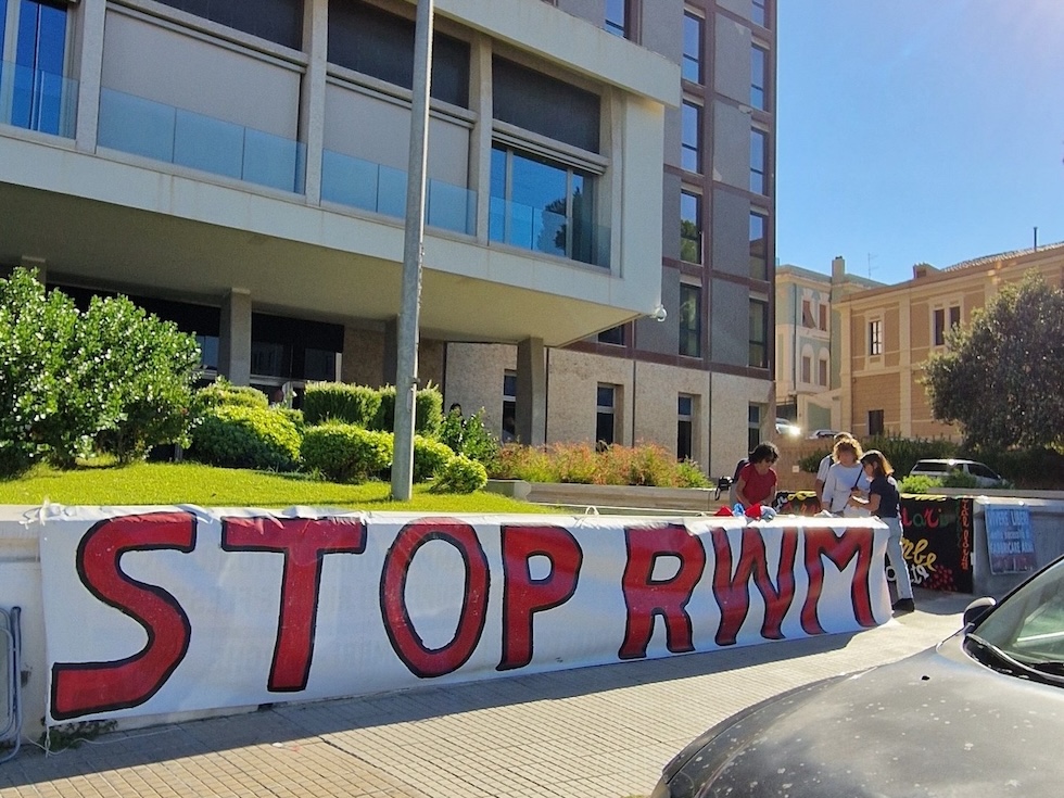 Lo striscione appeso sotto il palazzo della Regione Sardegna, a settembre (Campagna Stop RWM)