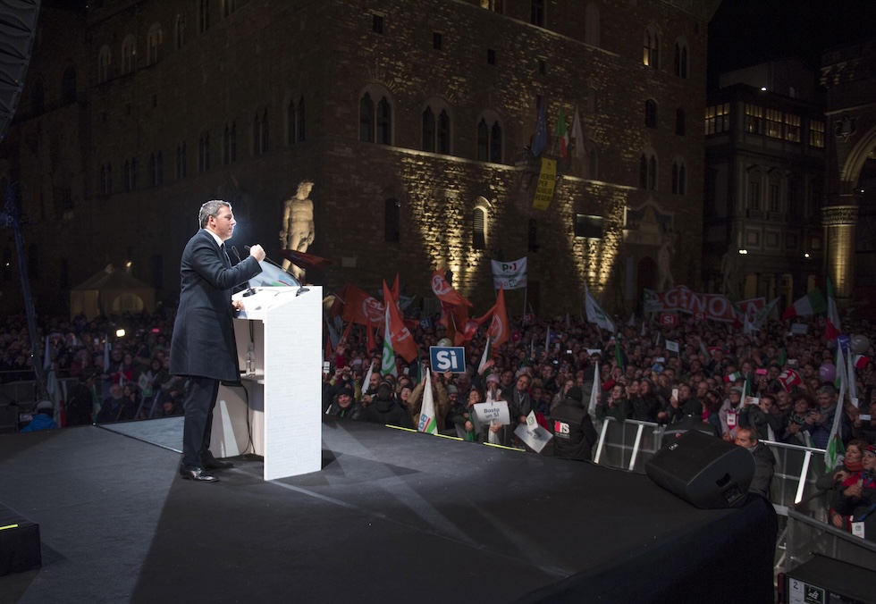 Matteo Renzi in un comizio a Firenze a sostegno del “sì” per il referendum costituzionale del dicembre 2016 (Ufficio stampa di Palazzo Chigi via ANSA/Tiberio Barchielli)