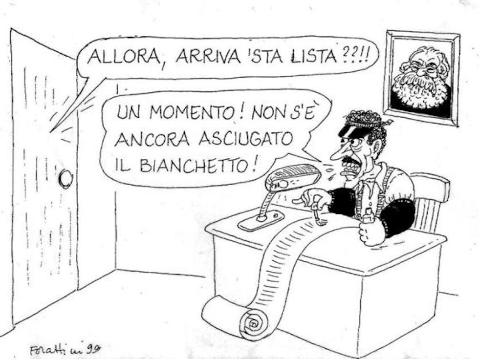 Repubblica pubblicò in prima pagina una vignetta di Forattini in cui Massimo D’Alema è seduto alla scrivania, con alle spalle un ritratto di Marx, e usa il bianchetto su un lungo rotolo di carta. Per questa vignetta Forattini venne querelato da Massimo D’Alema, che chiese un risarcimento di 3 miliardi di lire (che oggi sarebbero circa 2,5 milioni di euro), ma poi ritirò la richiesta. Il caso fu dunque archiviato con una dichiarazione di Forattini che diceva di «aver voluto esclusivamente fare della satira, senza alcun riferimento a fatti reali». In seguito a questa vicenda, non sentendosi sostenuto dal suo quotidiano, Forattini decise di lasciare Repubblica.