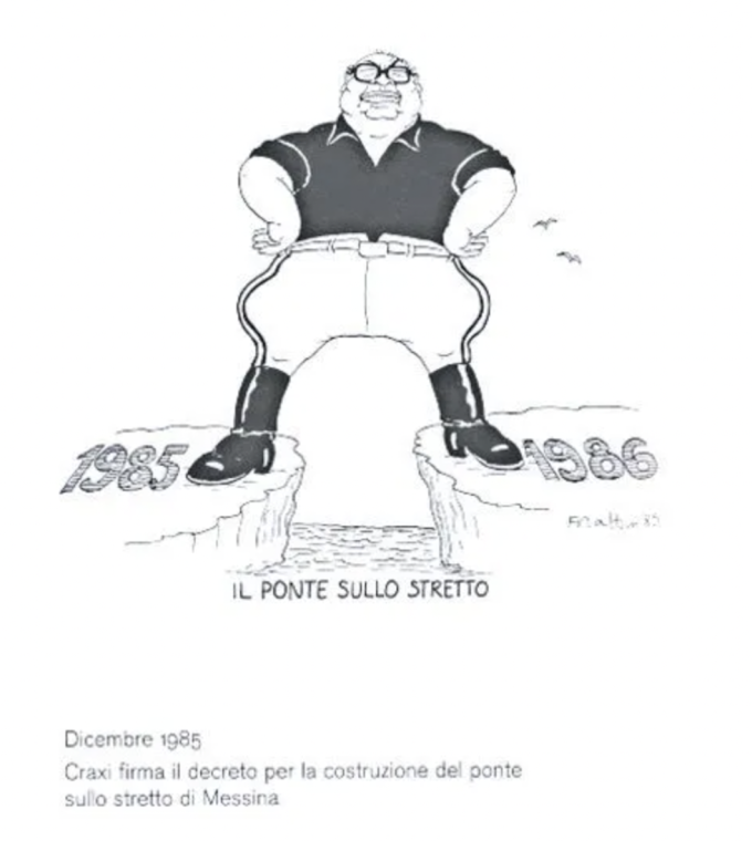Nel 1985 l’allora presidente del Consiglio Craxi firmò la convenzione per realizzare il ponte sullo Stretto di Messina, pronunciandosi a favore di una sua rapida realizzazione. Nel tempo, e soprattutto in piena stagione di Mani pulite, Forattini raffigurò spesso Craxi con la mascella volitiva e con gli stivali neri che ricordavano la figura di Benito Mussolini. Nell’aprile del 1993 lo raffigurò a testa in giù con un cappio legato ai piedi, a commento del fatto che il parlamento negò l’autorizzazione a procedere contro Craxi, chiesta dalla procura di Milano.