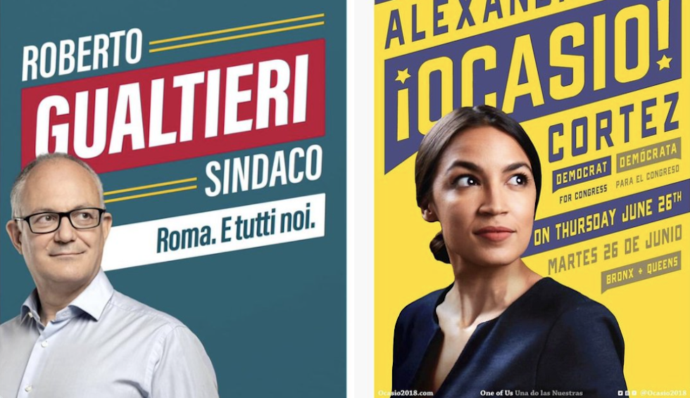 E nel 2021, durante le elezioni amministrative di Roma, i manifesti elettorali creati dallo staff dell’allora candidato sindaco Roberto Gualtieri erano ispirati in maniera palese a quelli di Alexandria Ocasio-Cortez, soprattutto nell’uso delle scritte oblique. Fu ancora più simile all’originale, praticamente identica, l’identità grafica della campagna elettorale di Alan Fabbri per le comunali di Ferrara del 2024, nonostante Fabbri fosse candidato con la destra. Così come fu uguale, sempre gialla e blu e con le scritte oblique, la grafica della campagna elettorale del comunista Ian Brossat per le elezioni europee del 2019.