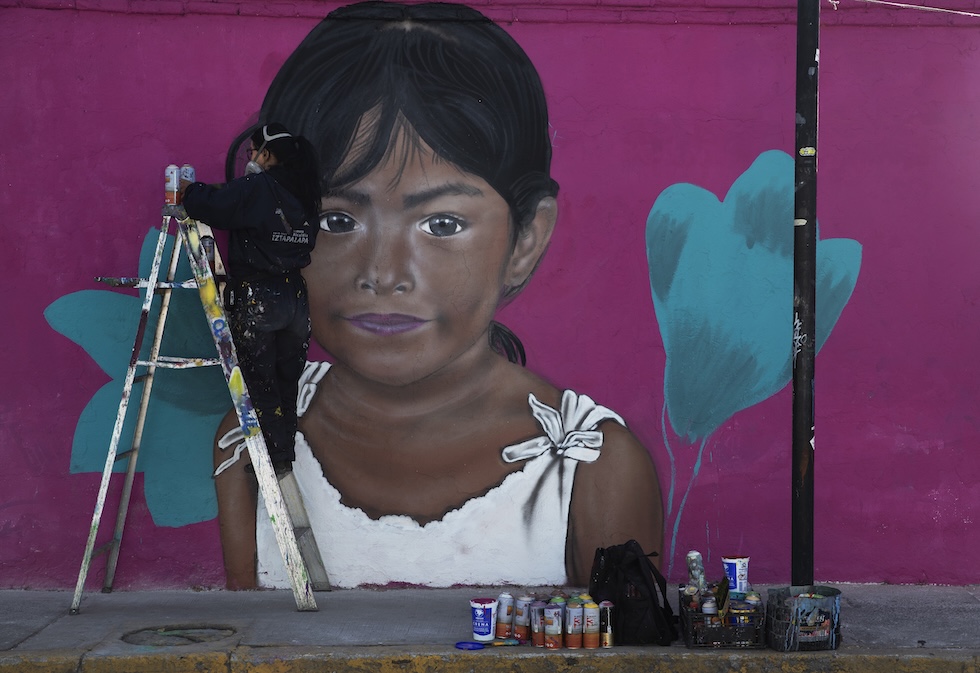 Un murale lungo la “Strada delle donne libere e sicure”, una via di Città del Messico con più luci e strutture per segnalare allarmi, pensata per rendere più sicuro per le donne il quartiere Iztapalapa: nel 2019 fu un’iniziativa dell’attuale presidente, allora sindaca (AP Photo/Marco Ugarte)