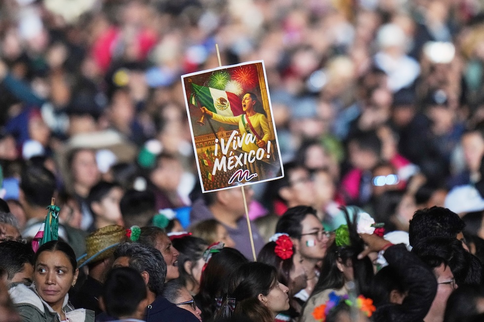 Un cartello raffigurante la presidente Claudia Sheinbaum durante i festeggiamenti per il giorno dell’Indipendenza, il 15 settembre (AP Photo/Eduardo Verdugo)