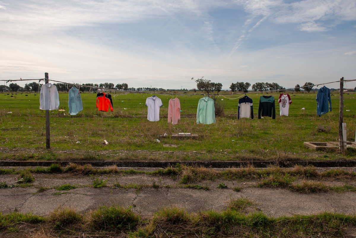 Panni stesi ad asciugare nel quartiere somalo di Borgo Mezzanone (Andrea Sabbadini per il Post)