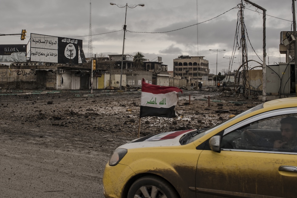Un iracheno guida la sua auto vicino a un cartellone pubblicitario dello Stato Islamico a Mosul, in Iraq, nel gennaio del 2017 (Martyn Aim/Corbis via Getty Images)