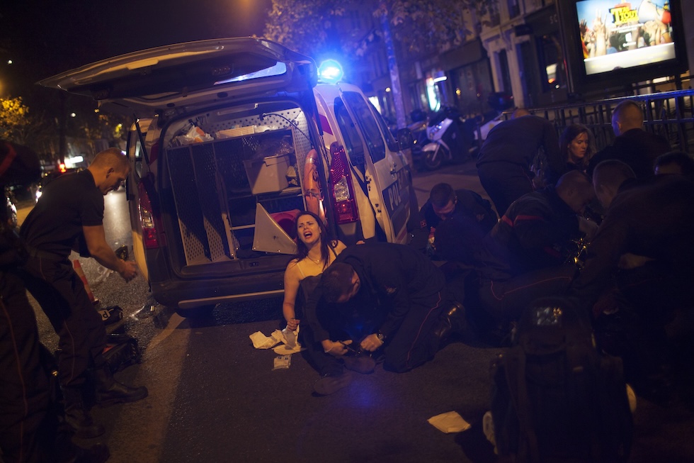 Una donna soccorsa fuori dal Bataclan, Parigi, 13 novembre 2015 (Pierre Terdjman/The New York Times/contrasto)