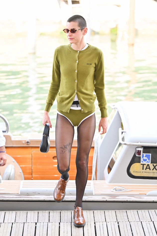 La celebrità che viene citata più spesso per questo tipo di abbigliamento “senza pantaloni” è Emma Corrin. L’attrice, testimonial di Miu Miu, aveva fatto molto parlare di sé quando aveva sfilato per la casa di moda nel 2023 indossando solo dei collant color vinaccia trasparenti con sopra delle mutande ricoperte di paillettes dorate, tutto abbinato a un elegante lupetto di lana beige. Corrin ha poi portato questo tipo di look anche in altre occasioni, per esempio alla Mostra del cinema di Venezia, sempre nel 2023, quando aveva indossato delle mutande semplici, molto più simili a un indumento intimo. In quell’occasione aveva indossato dei collant lasciando l’elastico a vista, un dettaglio proposto da Miu Miu anche in passerella, e studiato per dare ancora di più l’idea che si fosse dimenticata di mettere i pantaloni.