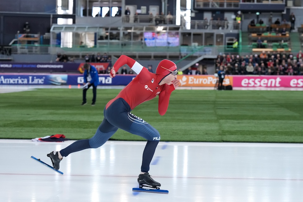 La norvegese Ragne Wiklund, sul cui pattino sinistro si vede bene il funzionamento della chiusura “clap” (Douwe Bijlsma/BSR Agency/Getty Images)