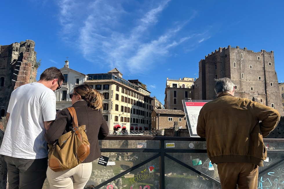 Turisti ai Fori Imperiali, sullo sfondo la Torre dei Conti (Il Post)