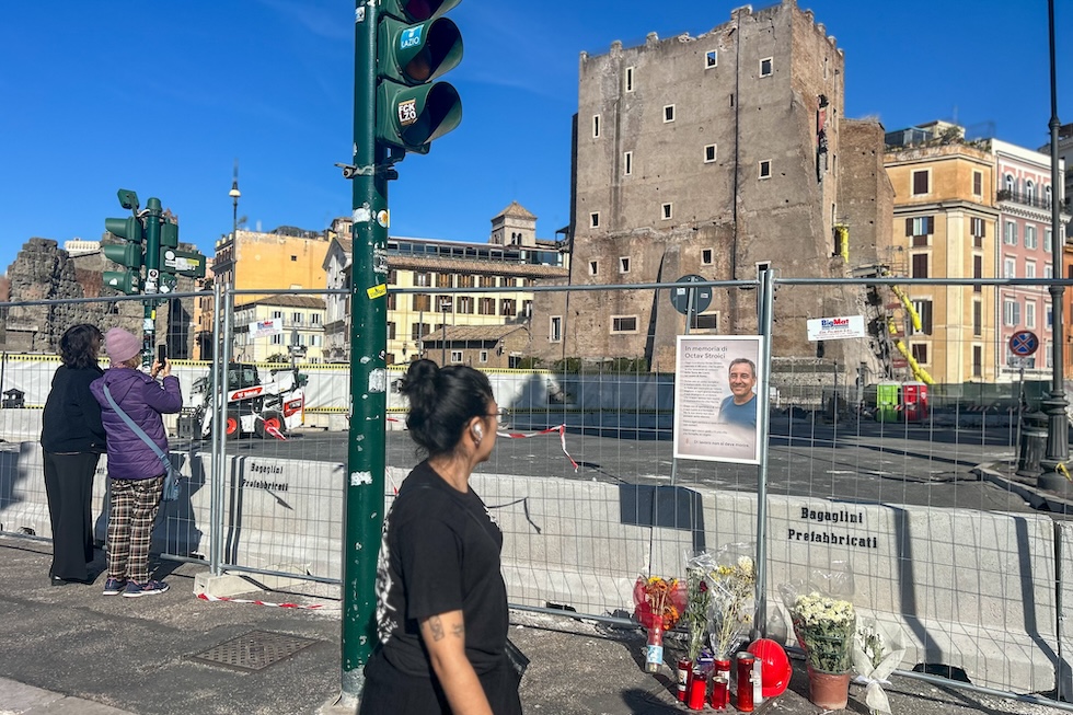 La Torre dei Conti vista da via dei Fori Imperiali e, su una transenna, un ricordo di Octay Stroici (Il Post)