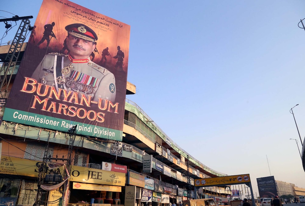 Un cartellone a Rawalpindi che celebra il generale Asim Munir e l’operazione Bunyan Marsoos, come è stata chiamata la recente guerra con l’India, il 14 maggio 2025 (PPI via ZUMA Press Wire)