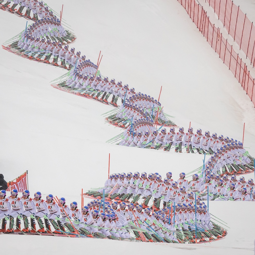 Lucas Pinheiro Braathen – molti Lucas Pinheiro Braathen – in una rappresentazione di vari momenti di un suo slalom, nel gennaio del 2025 a Kitzbuehel, Austria (Christian Bruna/Getty Images)