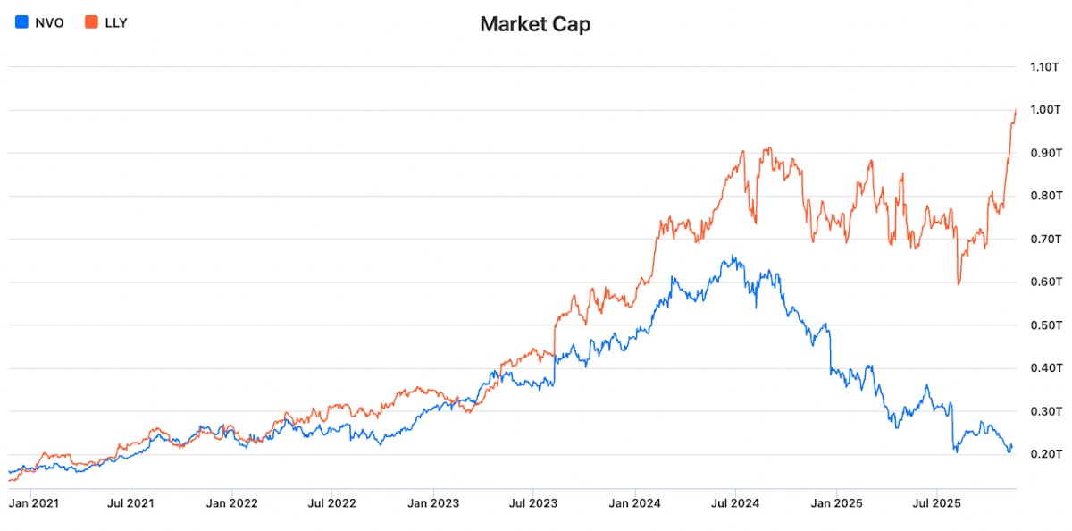 Il valore di mercato a confronto tra Eli Lilly (arancione) e Novo Nordisk (azzurro) negli ultimi cinque anni (Stock Analysis)