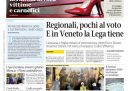 Su quasi tutti i giornali di oggi l’apertura è dedicata ai risultati delle elezioni regionali in Campania, Puglia e Veneto, dove come previsto hanno vinto il centrosinistra in Puglia con Decaro e in Campania con Fico e la destra in Veneto con Stefani. Qualche giornale ha una prima pagina speciale per la giornata internazionale per l’eliminazione della violenza contro le donne, il Sole 24 Ore titola sulla giornata positiva per la borsa americana, e la Verità si occupa delle critiche espresse dal presidente del Senato La Russa al consigliere della presidenza della Repubblica Garofani, mentre i giornali sportivi presentano le partite di stasera di Juventus e Napoli per la Champions League maschile di calcio.