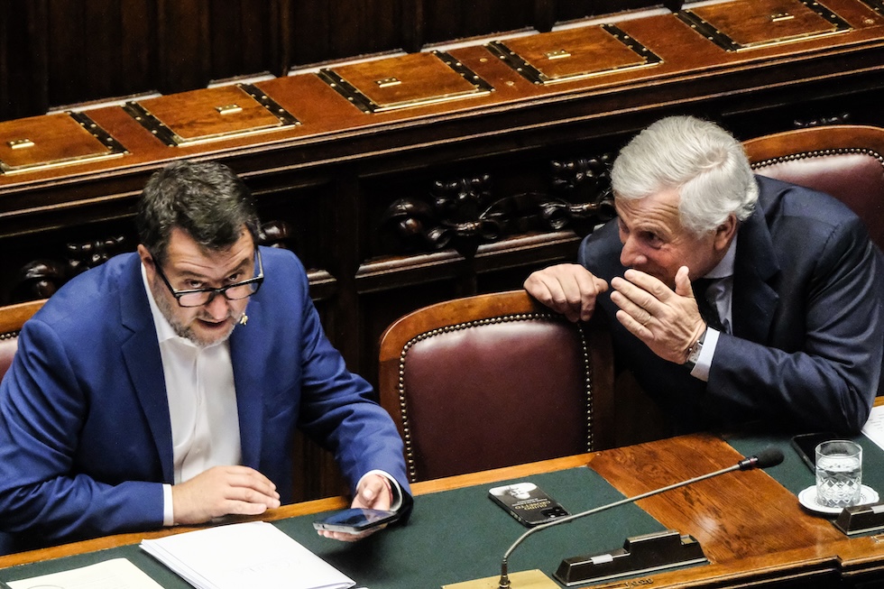 Il ministro dei Trasporti Matteo Salvini e quello degli Esteri Antonio Tajani alla Camera, il 28 maggio 2025 (Mauro Scrobogna/LaPresse)