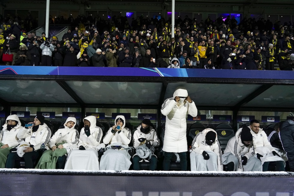 L’infreddolita panchina della Juventus, il 25 novembre a Bodo, Norvegia (EPA/Stian Lysberg)