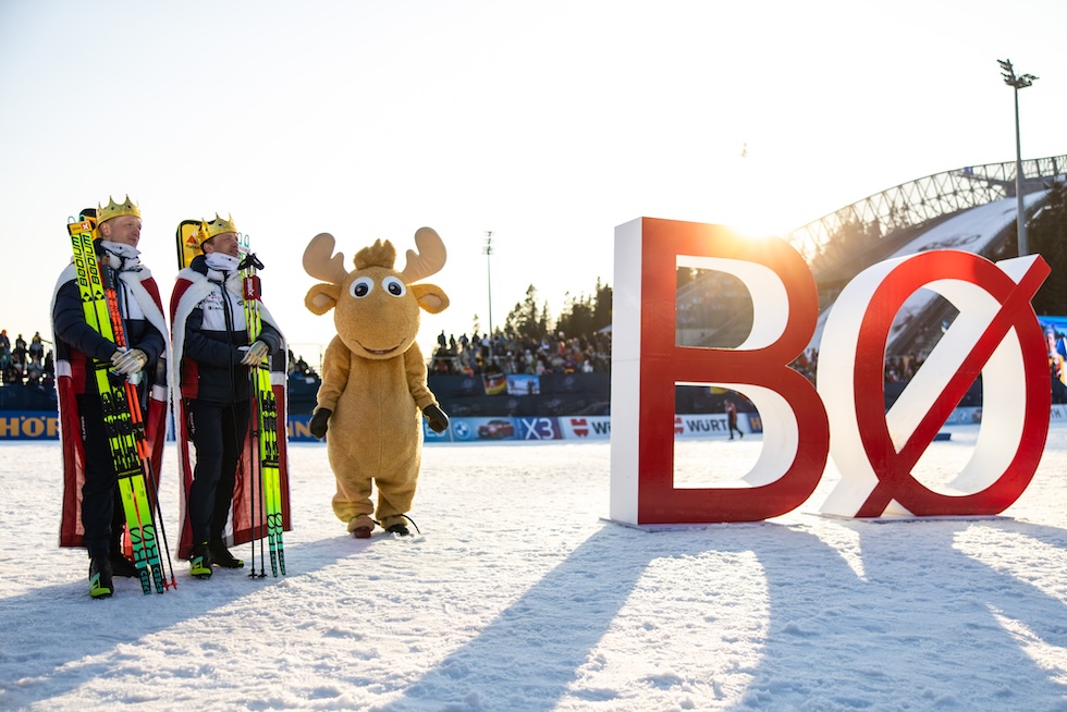 Johannes Thingnes Boe (o Bø, come scrivono in Norvegia) con il fratello Tarjei, anche lui atleta, durante una cerimonia di tributo per il loro ritiro, il 23 marzo 2025 a Oslo, Norvegia (Grega Valancic/VOIGT/GettyImages)