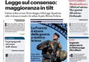 Ci sono notizie diverse in apertura sui giornali di oggi: alcuni si occupano delle discussioni politiche sul rinvio dell’esame da parte dell’aula del Senato, deciso dalla maggioranza su iniziativa della Lega, della proposta di legge che modifica il reato di violenza sessuale introducendo il concetto di consenso, altri si occupano della sparatoria a Washington vicino alla Casa Bianca nella quale sono stati feriti gravemente due agenti della Guardia Nazionale. Il Manifesto apre sulla situazione nella Striscia di Gaza, Libero intervista il sottosegretario alla presidenza del Consiglio Fazzolari, Domani si occupa degli affari del ministro della Difesa Crosetto, e i giornali sportivi commentano la sconfitta dell’Inter e la vittoria dell’Atalanta nelle partite di Champions League di ieri sera.