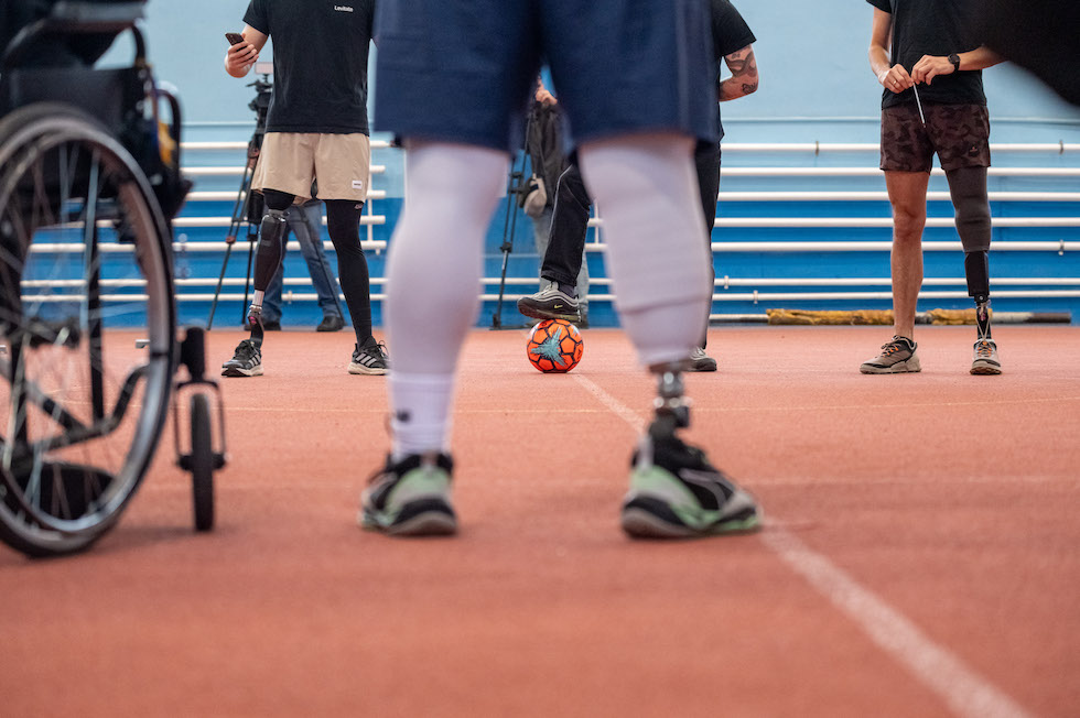 Una sessione di riabilitazione sportiva di alcuni soldati curati dall’Unbroken Center di Leopoli (Stanislav Ivanov/Global Images Ukraine via Getty Images)