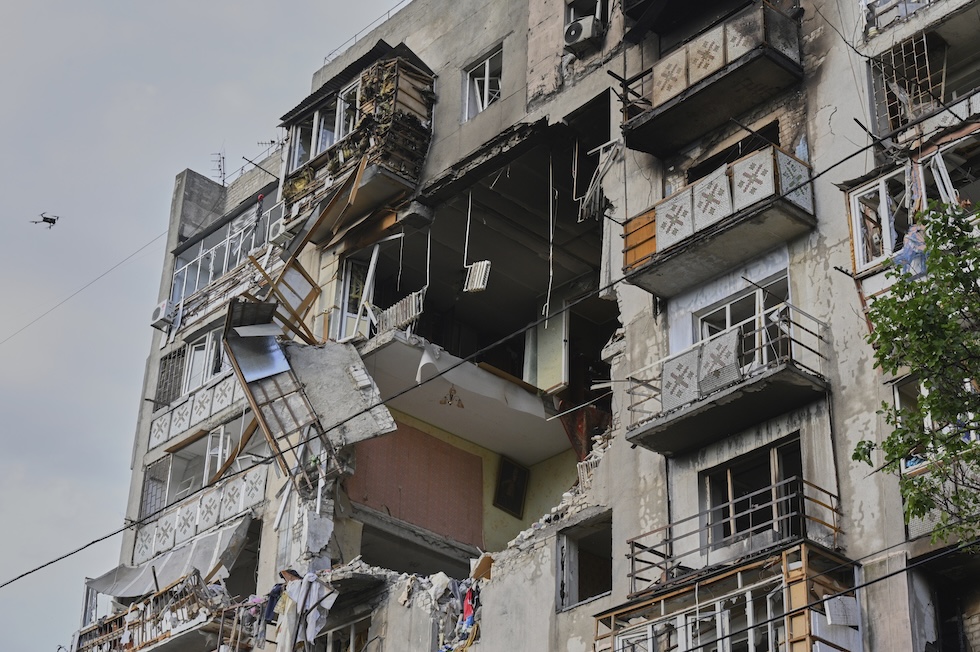 Un edificio residenziale distrutto da un bombardamento russo a Odessa, a luglio del 2025 (AP Photo/Michael Shtekel)