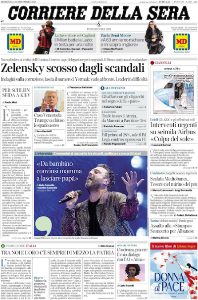 Stamattina i principali quotidiani aprono con notizie molto diverse, che vanno dallo scandalo di corruzione in Ucraina alla vandalizzazione della sede della Stampa, passando dalle nuove minacce di Donald Trump al Venezuela. I giornali sportivi si occupano soprattutto degli anticipi della giornata di Serie A di calcio maschile.