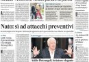 Sulla maggior parte dei giornali di oggi si parla in apertura di “tensione” fra la Nato e la Russia per le parole dell’ammiraglio Cavo Dragone, presidente del comitato militare della Nato, che in un’intervista al Financial Times ha detto che la Nato sta valutando la possibilità di una risposta più aggressiva alla guerra ibrida russa. Il Giornale apre invece sulle discussioni a Firenze e Bologna sulla cittadinanza onoraria a Francesca Albanese, relatrice speciale delle Nazioni Unite sui territori palestinesi occupati, mentre Avvenire segue il viaggio in Libano di papa Leone XIV.