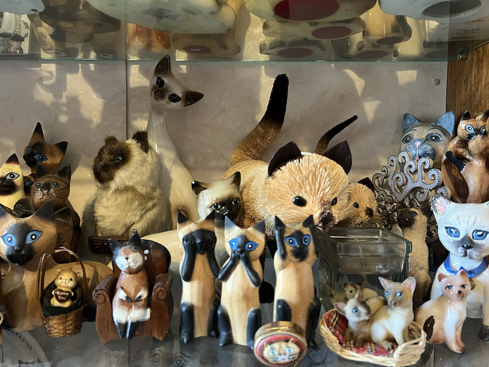 A vegliare sulla collezione c’è Eliot («come Eliot Thomas Stearns, lo scrittore»), uno dei gatti più amati, ancora presente nel ricordo dei suoi proprietari e nel ritratto a olio che lo raffigura. Dall’altro lato della stanza, Chérie, la prima gatta di Anna Maria e suo marito, fa da contraltare: la sua sagoma vive in uno specchietto a forma di gatto, con il nome inciso sopra. La collezione di Anna Maria è anche, a guardarla bene, un piccolo museo della memoria analogica: un archivio di cose amate o semplicemente necessarie che, come scriveva Borges nella sua poesia dedicata a Las cosas, «dureranno più in là del nostro oblio». I telefoni a filo, le schede telefoniche e gli altri oggetti che un tempo parevano eterni ma non lo sono più non testimoniano solo la storia dei gatti, ma anche quella delle tecnologie dismesse, delle abitudini cambiate, di un mondo analogico vissuto che non tornerà più. È la storia di prima che arrivassero le foto dei gattini su internet.