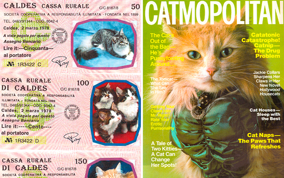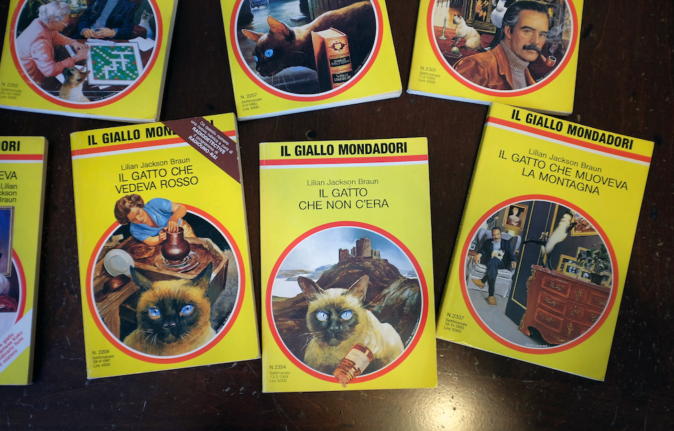 Qua e là nella collezione spuntano anche gatti celebri, veri o immaginari: Felix, Garfield, Silvestro, ma anche Larry, il gatto di Downing Street, e Socks, il gatto di Bill Clinton, immortalato su un francobollo della Repubblica Centrafricana, o ancora i tre gatti di Taylor Swift, protagonisti di un libro uscito quest’anno. Scopriamo dell’esistenza di Catmopolitan, parodia degli anni Ottanta di Cosmopolitan, dove i mici ricreano le campagne di bellezza dell’epoca, da Clinique a L’Oréal. Negli anni Novanta, invece, qualcuno in Spagna inventò Cham-Cat, un’elegante bottiglia da brindisi felino, confezionata come champagne ma in realtà con croccantini al pollo. In anticamera, una disordinata pila di libri contiene una serie di gialli Mondadori degli anni Settanta con titoli come Il gatto che leggeva alla rovescia, Il gatto che vedeva rosso, Il gatto che mangiava i mobili, tutti di Lilian Jackson Braun (1913-2011), autrice della longeva serie The Cat Who… (“Il gatto che”, appunto).