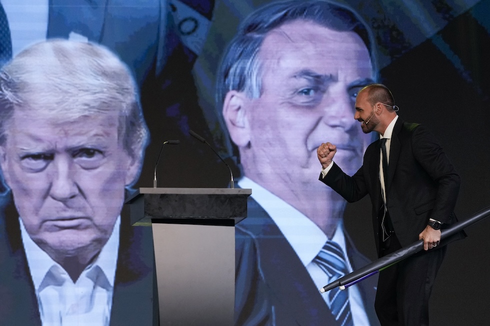 Eduardo Bolsonaro a una conferenza che riuniva esponenti delle destre mondiali a Buenos Aires, nel dicembre del 2024 (AP Photo/Natacha Pisarenko)