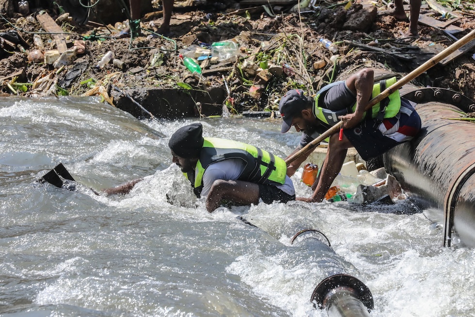 I lavori per liberare un canale dai detriti alla periferia di Colombo, in Sri Lanka (EPA/CHAMILA KARUNARATHNE)