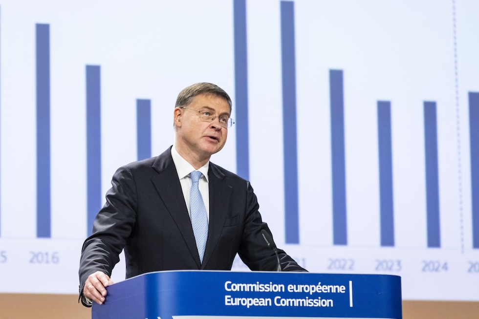 Il commissario europeo Valdis Dombrovskis a novembre del 2025 (Nicolas Landemard/Le Pictorium Agency via ZUMA Press)