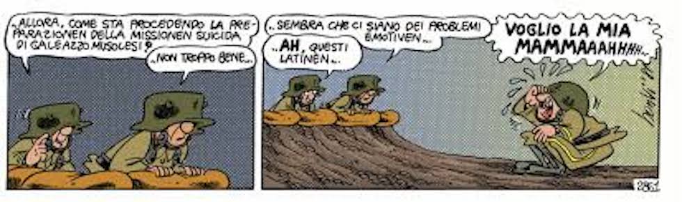 Tra loro c’era anche un italiano, il “fiero alleaten Galeazzo Musolesi”, un riferimento neppure troppo velato a Benito Mussolini e al suo genero, Galeazzo Ciano. Era il personaggio più codardo e approfittatore del gruppo, e inventava spesso curiosi stratagemmi per mantenersi il più lontano possibile dalla linea del fronte. L’altra sua specialità era approfittarsi dell’ingenuità dei commilitoni per farsi gli affari propri. Quando comunicava ad alta voce una delle sue trovate, spesso gli altri soldati gli dicevano: «Ach! Diafolo di un Musolesi!».