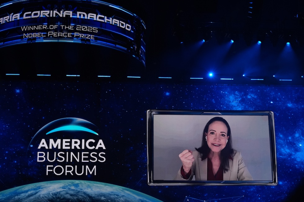 María Corina Machado partecipa attraverso un collegamento video all’America Business Forum, una riunione per imprenditori e investitori, il 5 novembre 2025 (AP Photo/Rebecca Blackwell)