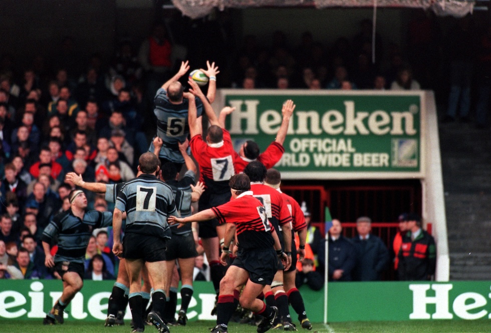 Una touche nel 1996, durante una partita di Heineken Cup tra Cardiff e Tolosa (Dave Rogers/ALLSPORT)