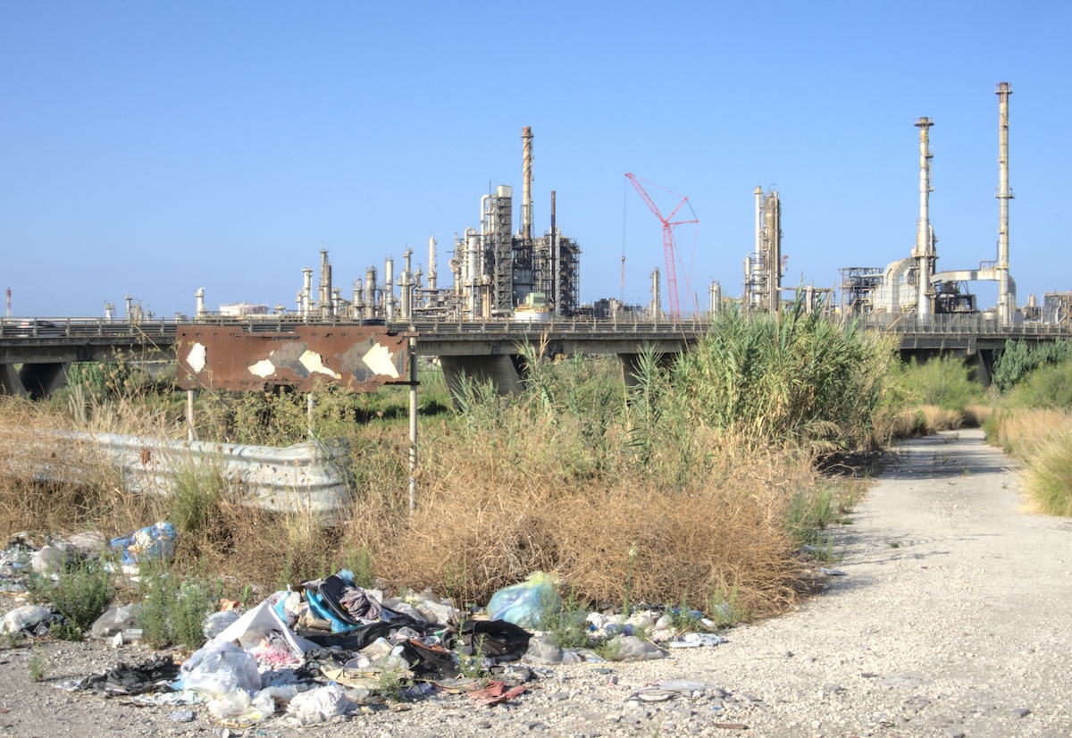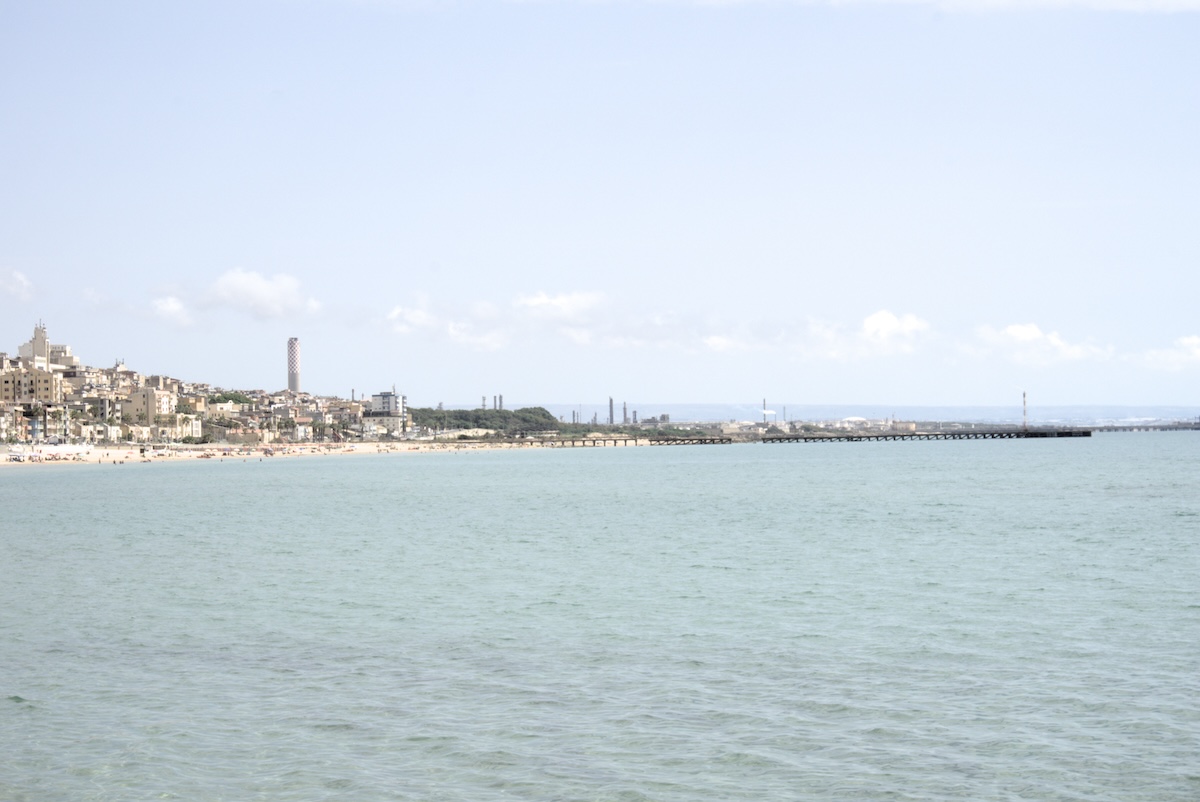 Il sito petrolchimico in fase di dismissione a poche centinaia di metri dalla principale spiaggia della città (Simone Fant/il Post)