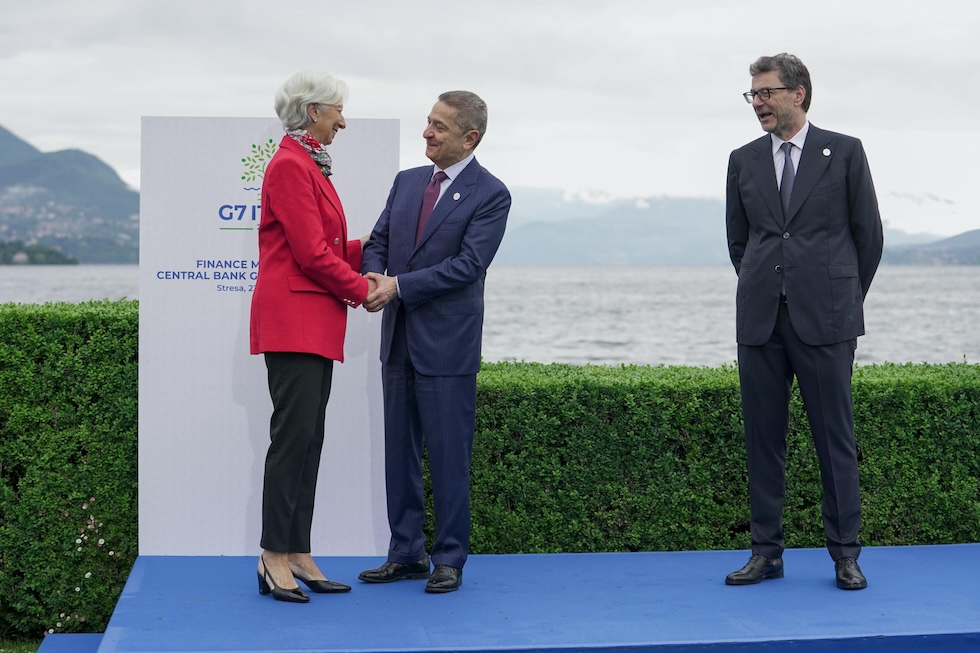 A sinistra la presidente della BCE Christine Lagarde mentre stringe la mano al governatore Panetta, a maggio del 2024; a destra Giorgetti (ANSA/JESSICA PASQUALON)