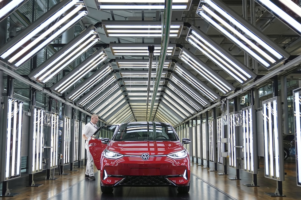 Un lavoratore dello stabilimento di Dresda controlla una ID.3 (AP Photo/Matthias Schrader)