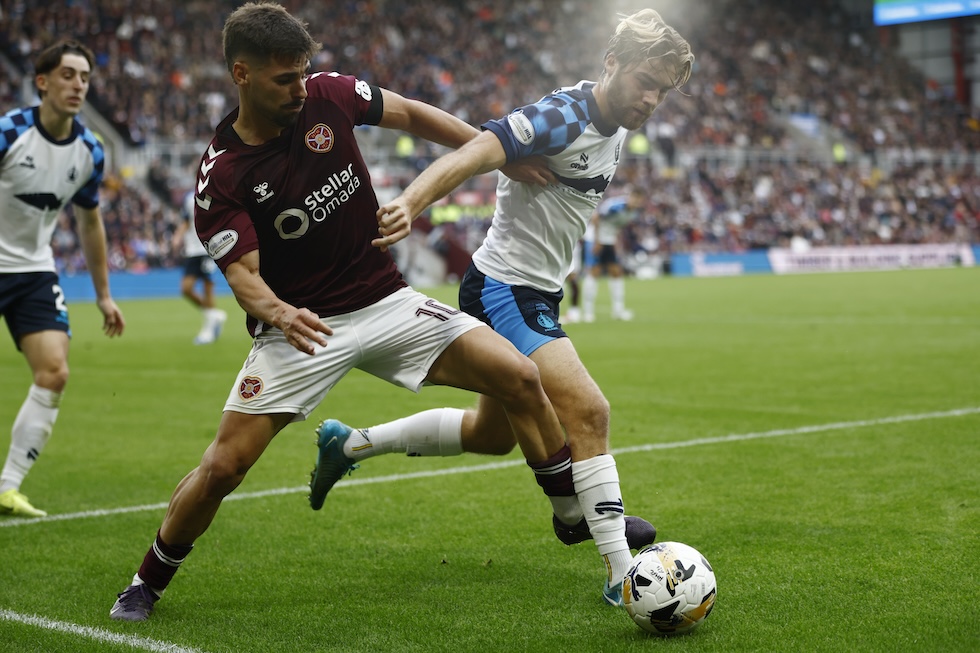 L’attaccante portoghese dell’Heart of Midlothian Cláudio Braga (a sinistra) durante una partita di campionato contro il Falkirk, 27 settembre 2025 (Zak Mauger/Getty Images)
