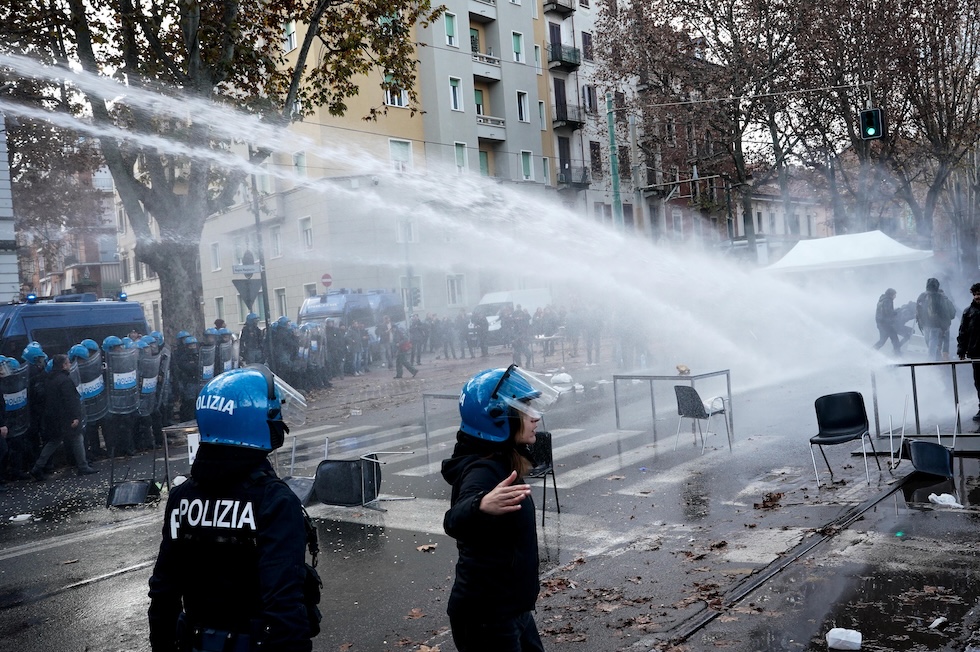 La polizia usa degli idranti contro i manifestanti durante il presidio contro lo sgombero dell’Askatasuna, il 18 dicembre 2025 (ANSA/TINO ROMANO)