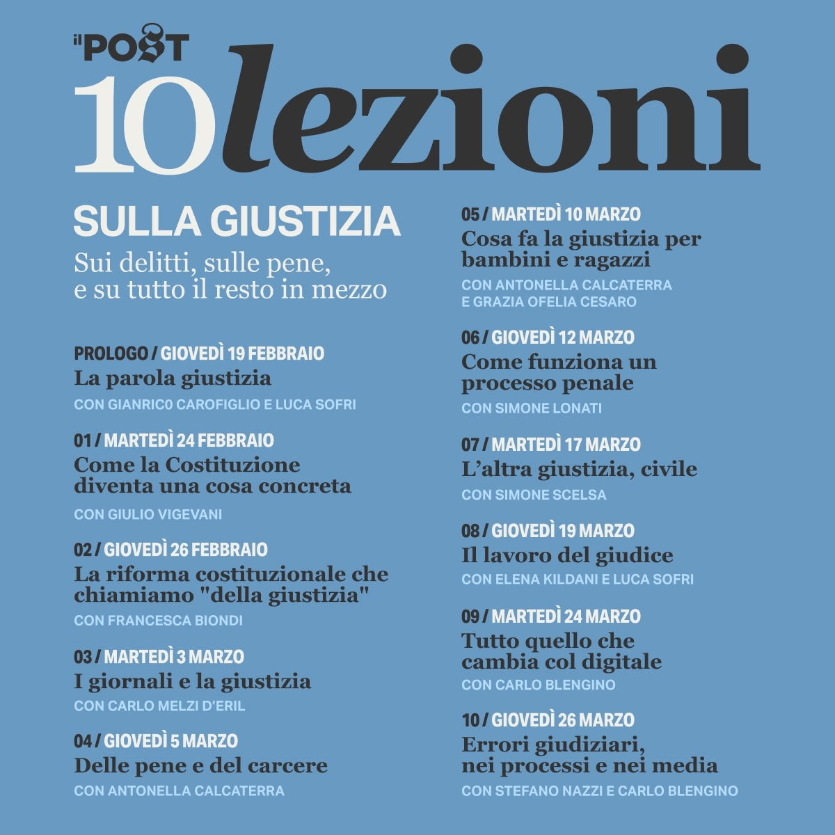 Le lezioni inizieranno il 19 febbraio nel loro ormai consueto e apprezzato formato: due incontri online alla settimana, ogni martedì e giovedì dalle 19 alle 20:30, con la possibilità di fare domande in chat ai docenti durante e alla fine della diretta, e di vedere le lezioni registrate nei giorni successivi, fino al 31 luglio 2026. Iscriversi alle “Dieci lezioni sulla giustizia” costa 290 euro, e 240 euro per le persone abbonate al Post (alle quali basta accedere col proprio account prima di acquistare il corso per ricevere lo sconto). Le iscrizioni saranno aperte fino a mercoledì 18 febbraio. Qui puoi iscriverti, oppure iscrivere una persona a cui vuoi regalare gli incontri.