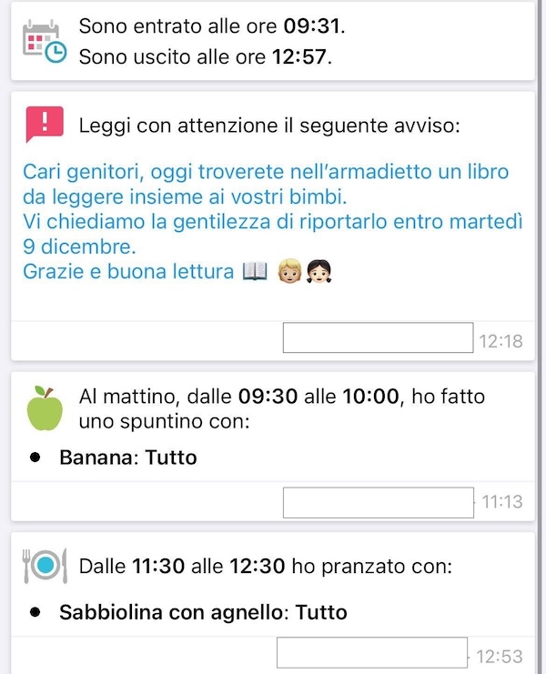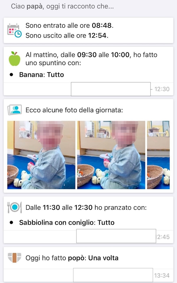 La prima notifica arriva al mattino, quando il bambino viene accolto al nido. Poi in genere ne arriva un’altra che certifica il primo spuntino, una dopo pranzo, una che informa quanto è durato il riposino, e una sulla merenda. Vengono inviate quasi sempre alla stessa ora. A queste si aggiungono le segnalazioni “extra”: quando il bambino ha fatto la cacca, oppure se vengono scattate foto dell’attività di giornata.