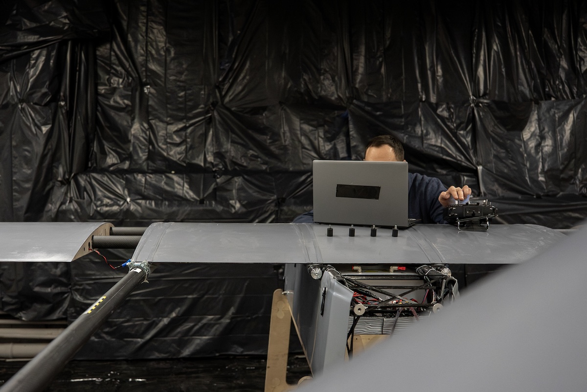 La fase finale della produzione di un drone a lungo raggio ucraino. La parete è coperta con plastica nera per non dare indicazioni sulla posizione dello stabilimento (Alex Babenko per il Post)