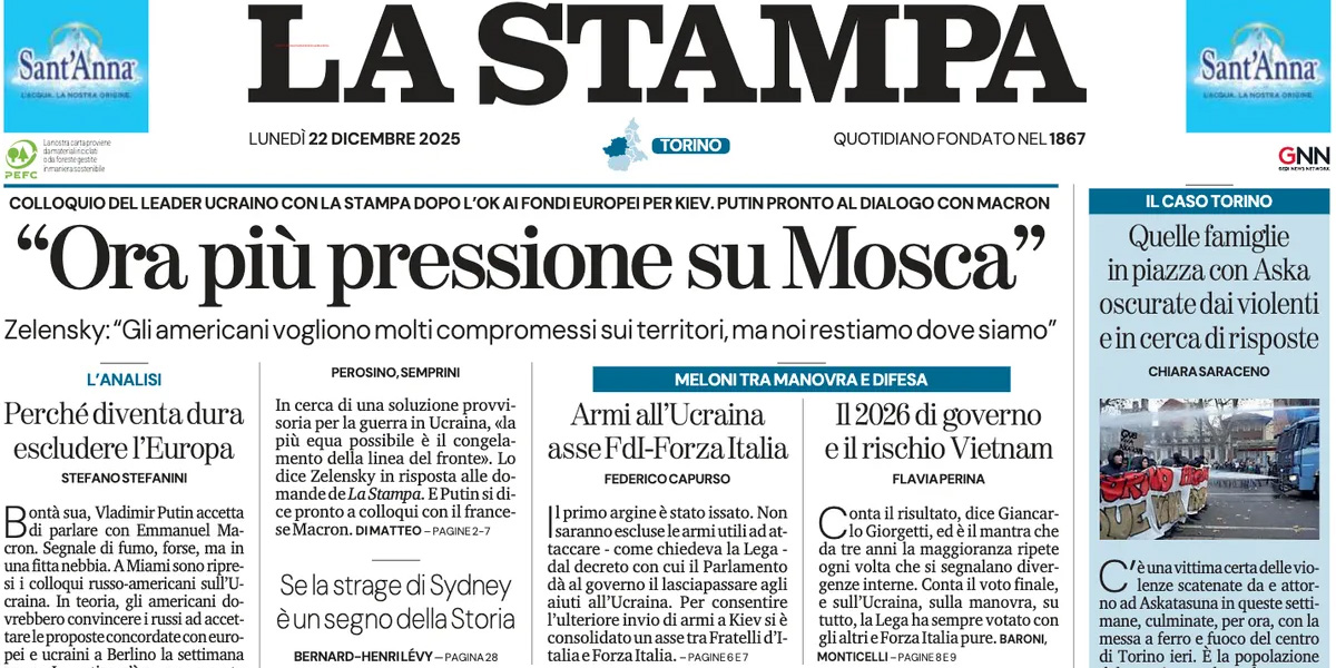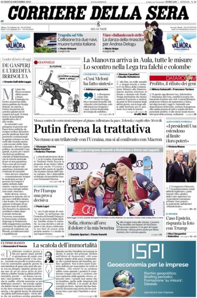 Le due notizie principali in apertura sui giornali di oggi sono la legge di bilancio, che dopo l’approvazione della Commissione bilancio del Senato sarà esaminata oggi dall’aula con il voto finale previsto per domani, e la trattativa per far finire la guerra fra Russia e Ucraina, con il rifiuto del presidente russo Putin di un incontro fra i leader di Russia, Ucraina e Stati Uniti e la controproposta di un confronto con il presidente francese Macron. Il Giornale critica le iniziative dell’ultimo periodo del segretario della CGIL Landini, e la Verità e Libero si occupano della vicenda dell’adolescente tredicenne per cui il tribunale ha autorizzato la transizione di genere.