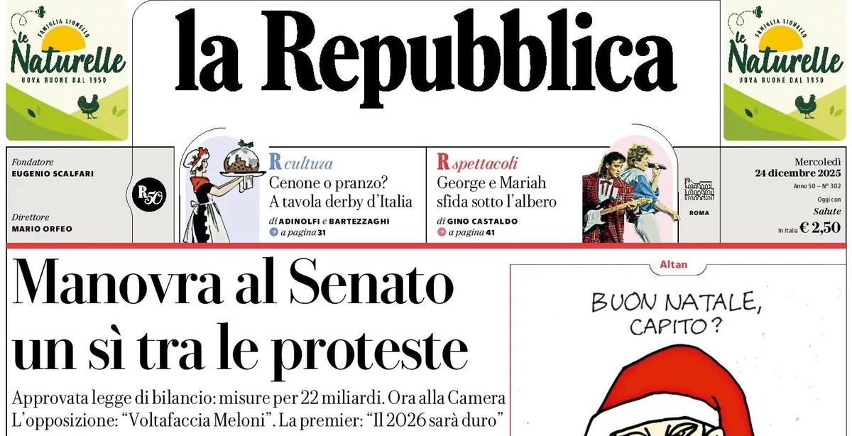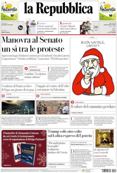 I principali giornali nazionali aprono sulla notizia della legge di bilancio approvata ieri dal Senato, tra varie polemiche sul “maxiemendamento” presentato nei giorni scorsi dal governo: ora la Camera avrà tempo fino a fine anno per esaminarla e approvarla in via definitiva senza poterla modificare. Tra le altre notizie si parla molto dei nuovi documenti sul caso Epstein (i cosiddetti “Epstein files“) pubblicati dal dipartimento di Giustizia degli Stati Uniti, del grande attacco della Russia alle infrastrutture energetiche ucraine, che hanno lasciato diverse regioni senza energia elettrica, e del capo dell’esercito libico morto in un incidente aereo.